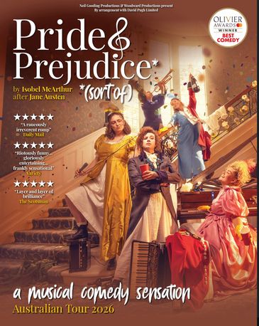DIRECT FROM THE WEST END PRIDE AND PREJUDICE* (*SORT OF) IS A UNIQUE AND AUDACIOUS RETELLING OF JANE AUSTEN’S MOST ICONIC LOVE STORY. MEN, MONEY AND MICROPHONES WILL BE FOUGHT OVER IN THIS IRREVERENT BUT AFFECTIONATE ADAPTATION WHERE THE STAKES COULDN’T BE HIGHER WHEN IT COMES TO ROMANCE.